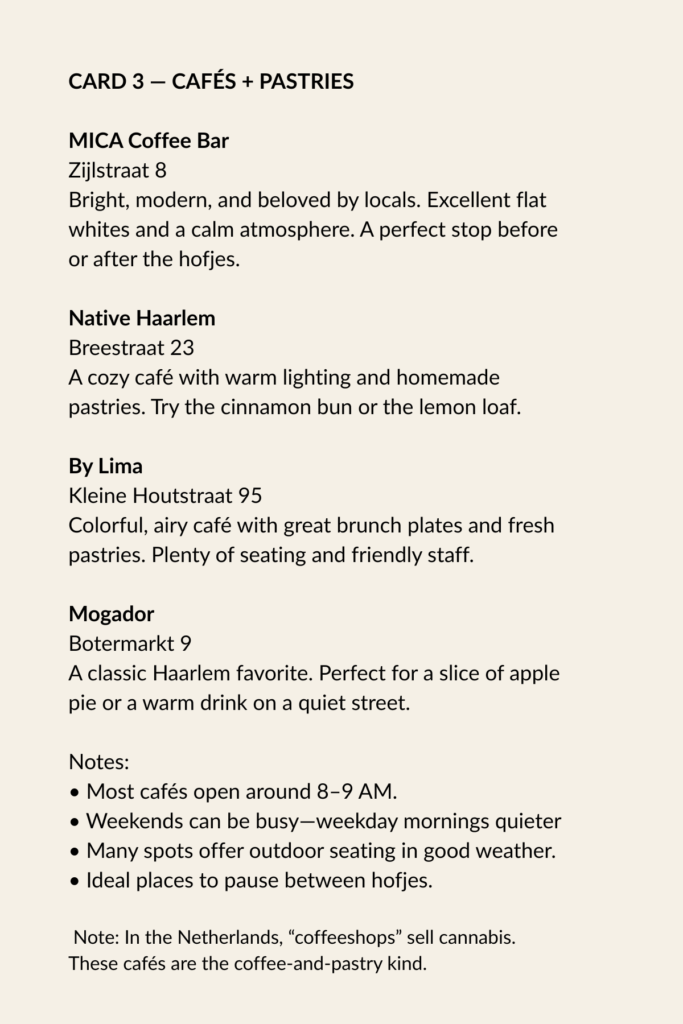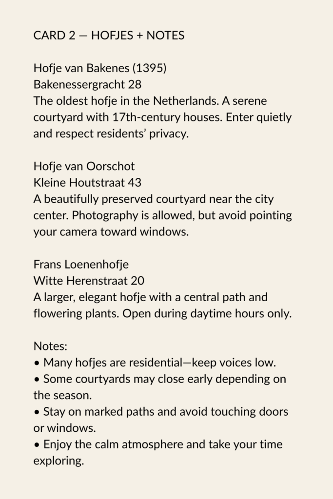 Use these three cards to follow the route, find the hofjes, and pause for something good to eat.
