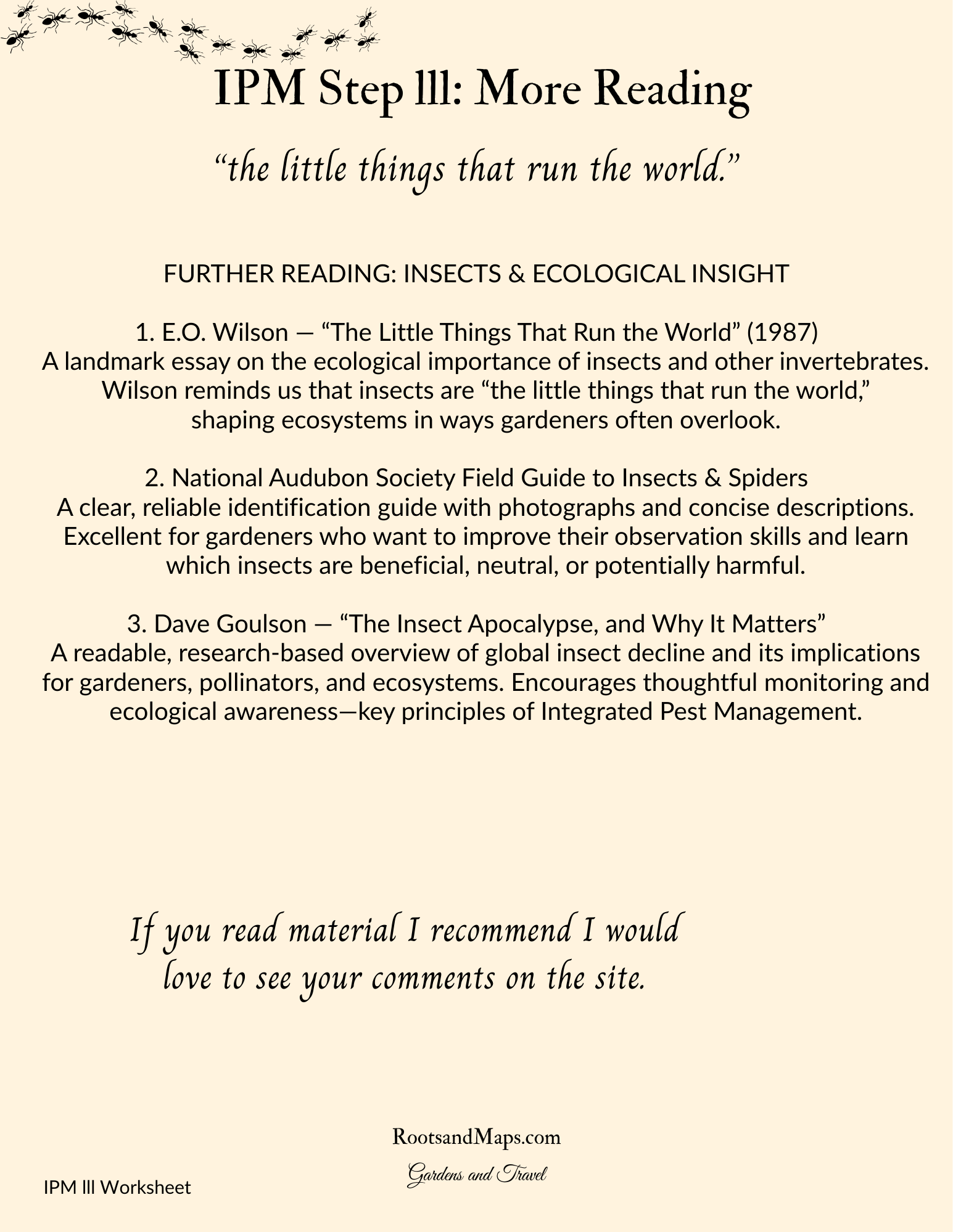A foundational essay explaining the ecological importance of insects and other invertebrates. Wilson’s perspective reframes insects as essential ecosystem engineers — a mindset that strengthens any gardener’s approach to monitoring and IPM. Key line: “…the little things that run the world.”